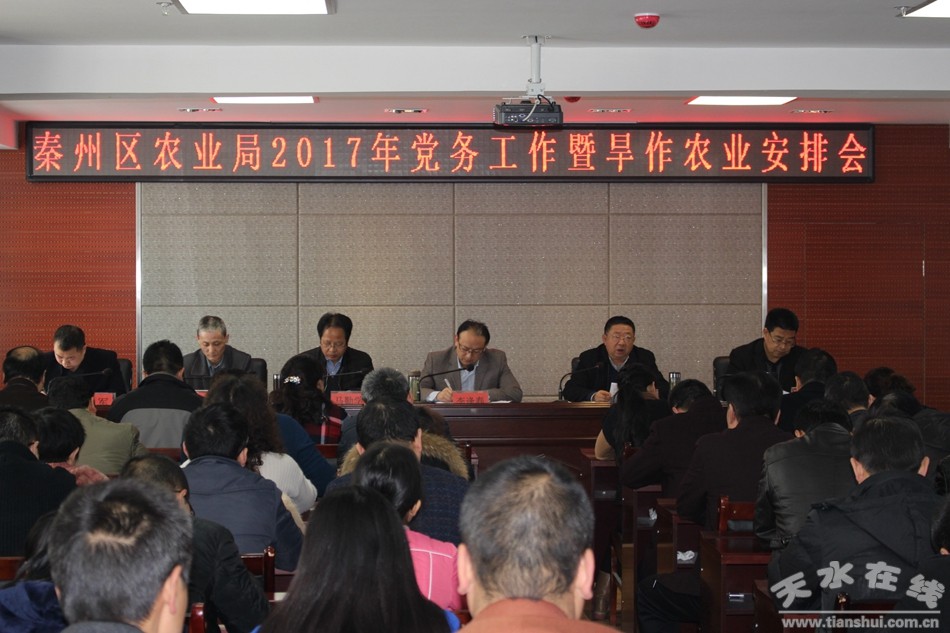 2月21日,秦州区农业局党委书记、局长李逢春主持召开2017年党务工作暨旱作农业工作安排会,局党委班子成员、局属各单位班子成员和干部职工共计80余人参加了会议。