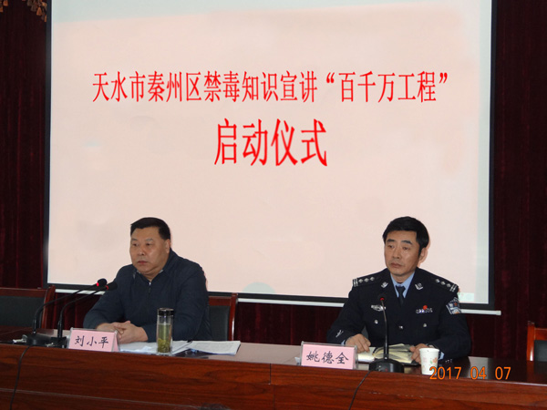 启动仪式上,刘小平在作动员讲话中指出,禁毒知识宣讲“百千万工程”是按照中央、省、市禁毒工作要求,将禁毒预防教育工作纳入干部培训计划和青少年教育、重点高危人群教育、全民普及教育的一项重要的民心工程,对于提高全民特别是广大党员干部、青少年的禁毒知识水平,加强禁毒宣传教育,将禁毒预防教育工作落到实处起到积极的推动作用,对组织好、发动好群众参与禁毒斗争的热情,切实筑牢禁毒防火墙,在全区掀起禁毒人民战争新高潮具有十分重要的意义。各有关单位要按照《秦州区百名领导宣讲禁毒知识活动方案》要求,切实把毒品预防教育作为解决毒品问题的治本之策,充分发动禁毒委各级领导、基层干部、民警、专家学者到学校和公共娱乐场所授课,在授课活动的广度、深度和难点问题上下功夫,始终把青少年教育、重点高危人群教育、全民普及教育做为授课活动的出发点和落脚点,把在学校授课和公共复杂场所宣传有机结合起来,循序渐进,不断改进授课方式,实现我区禁毒宣传教育工作的跨越式提升。