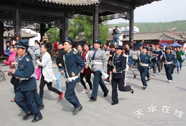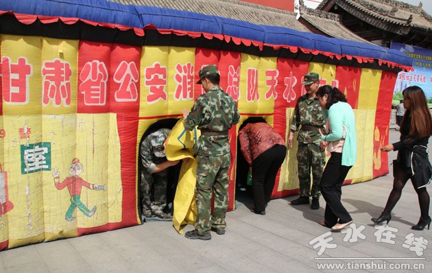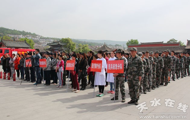 本次演练活动在区武装部、国土资源局、区安监局、区地震局、区消防大队、区防汛办等相关单位的指导下进行,参与群众达300余人。上午10时许,各演练方队整列站立,共同为四川汶川地震中遇难的同胞默哀1分钟。随后随着一声警报声拉起,演练活动正式开始。“灾情”发生后,参演群众从周边居住地紧张而快速有序地向广场集合,志愿者手持喇叭,大声提醒“大家注意安全,请快速疏散到伏羲广场”。居民群众在志愿者的引领下快速集合到了伏羲广场中心。现场指挥员接到“灾情”发生地工作人员报告:枣园巷平房倒塌,一居民被困在房内,无法逃离,情况万分紧急。指挥员发出紧急命令,民兵队伍第一时间集合动员,立即赶往现场进行救援,医护人员和车辆迅速跟进,对被压居民实施救援并迅速撤离。整个演练活动有条不紊紧张有序。最后,区消除支队在现场进行了消防器材的展示和演练,并对生活中常见的消防安全知识进行了现场讲解。同时,西站社区设立了消防安全知识宣传点,展示防灾减灾宣传版20余幅,散发宣传资料500余份。
