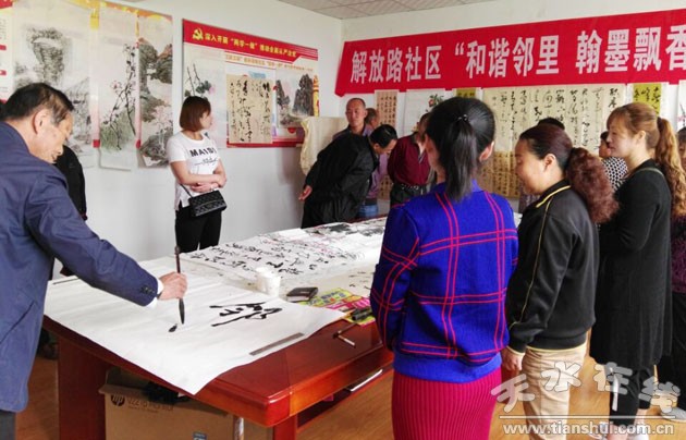 五是“和谐邻里 翰墨飘香”书画交流。解放路社区举办邻里书画展活动,共展出作品30多幅,均来自社区老年党员和居民之手,有篆体、隶体等字体和部分水彩画、国画,吸引了众多居民前往欣赏观看,赢得了大家的一致赞叹。