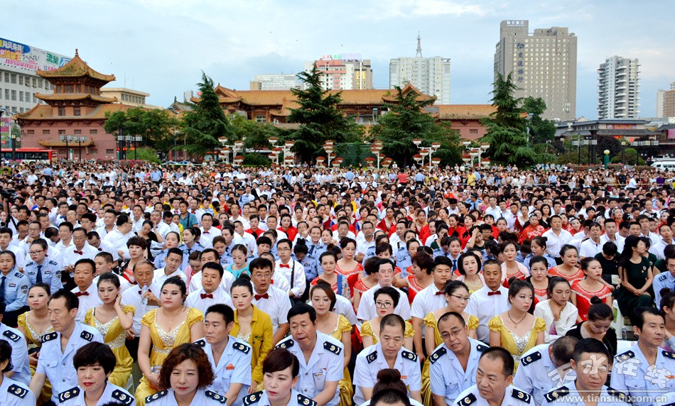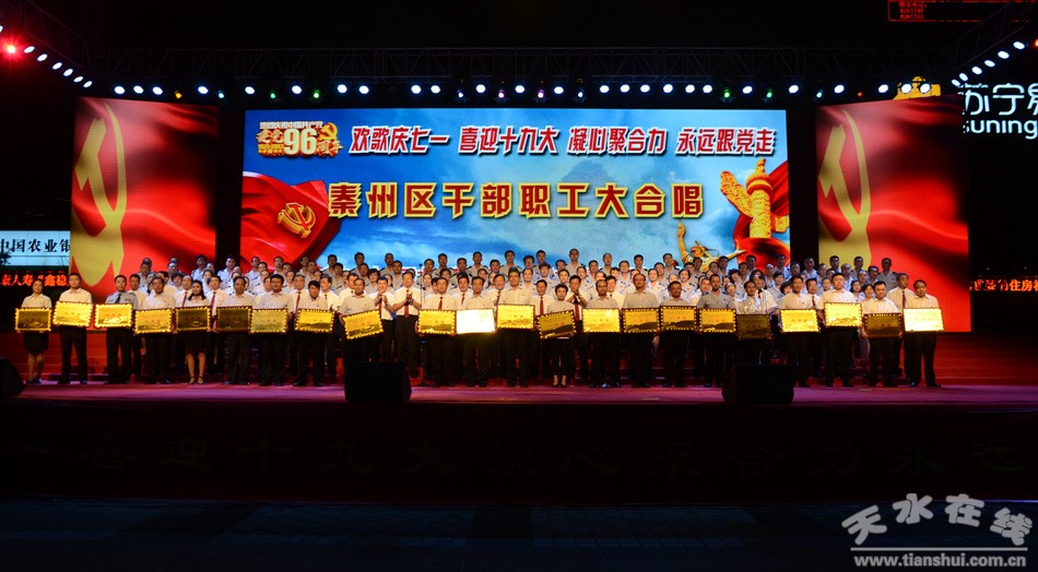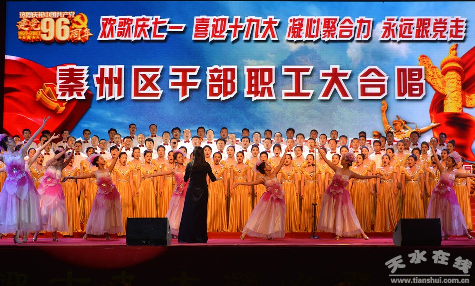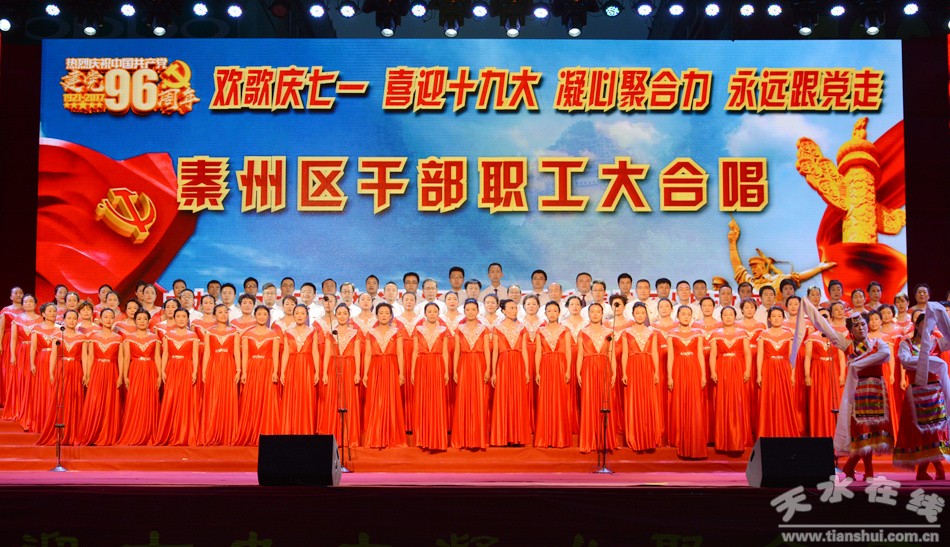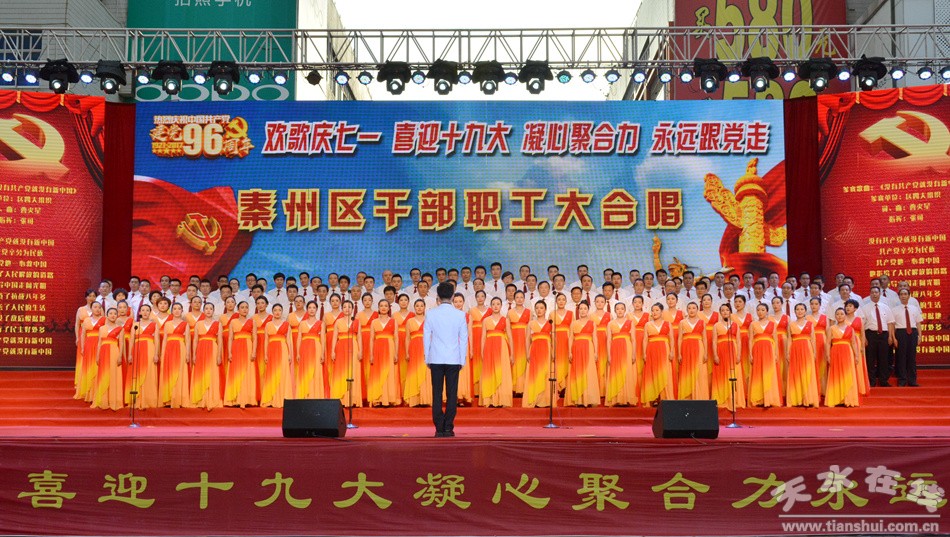(秦州区外宣办)“奋进秦州谱新曲,合声阵阵颂党恩。”为隆重纪念建党96周年,喜迎党的十九大,6月29日,秦州区干部职工大合唱汇演在龙城广场举行,全区上下欢歌庆七一,喜迎十九大,凝心聚合力,永远跟党走。市委常委、区委书记雷鸣,区人大常委会主任文月平,区委副书记、区长刘文玺,区政协主席宋丕林及全体四大组织领导参加活动。