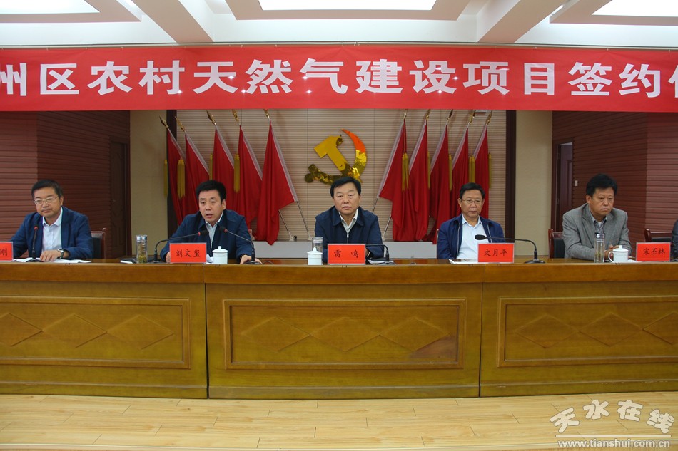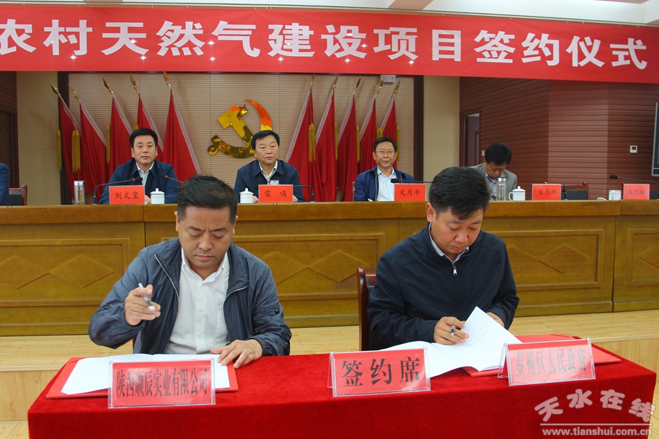 (秦州区外宣办)9月4日,秦州区农村天然气建设项目签约仪式在区委礼堂举行。市委常委、区委书记雷鸣,区人大常委会主任文月平,区委副书记、区长刘文玺,区政协主席宋丕林,区委常委、常务副区长王永刚,区委常委、统战部长王晓彤等出席签约仪式。区政府副区长罗增芳和陕西顺辰实业有限公司负责人赵炬淋分别代表政企双方签订了项目合同。