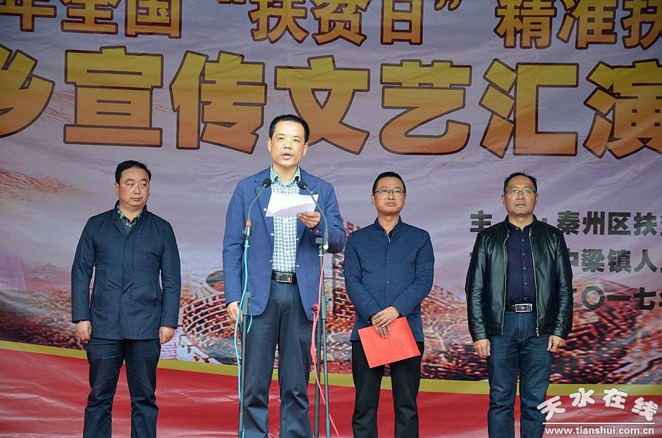 文艺汇演开始前,秦州区扶贫办副主任贺小东首先致辞,中梁镇党委副书记、镇长谢建平讲话。贺小东说,贫困问题是全球的共性问题,消除贫困是当今世界所面临的最紧迫的民生问题,秦州区扶贫开发工作在区委,区政府的坚强领导和大力支持下,经过全区人民的不懈努力,取得了巨大的成就,已从解决温饱转入巩固温饱成果,加快脱贫致富,缩小发展差距的新阶段。但由于受历史、自然和经济基础等各方面因素的制约,全区贫困面广,贫困程度深的现状,还没有根本改变,扶贫攻坚脱贫致富,到2020年与全国一道全面进入小康社会的任务仍然十分艰巨和繁重,把穷根斩断,不让贫穷代际相传我们要做的工作还很多,迫切需要社会各界的广泛参与和大力支持。