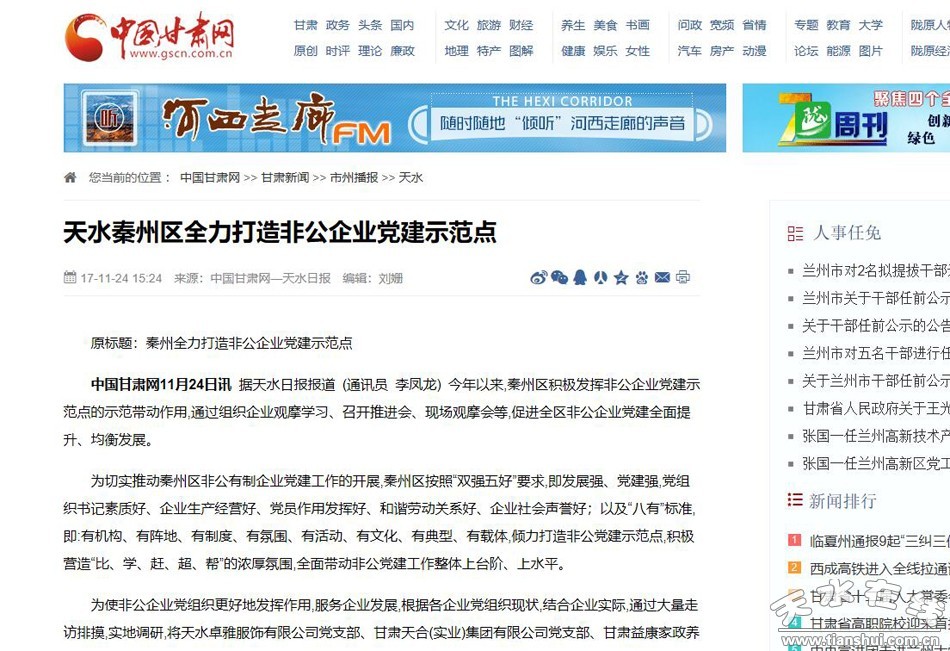 日前,甘肃天河(实业)集团有限责任公司党支部和天水市国税局机关服务中心党支部结对共建,学习贯彻落实十九大精神的活动登上天水电视台《直播天水》头条新闻,在全市非公企业中产生了广泛影响。节目视频在秦州区非公企业党建微信群和企业主朋友圈中迅速传播。这是秦州区倾力打造非公党建示范点,充分发挥示范引领作用的一个缩影。
