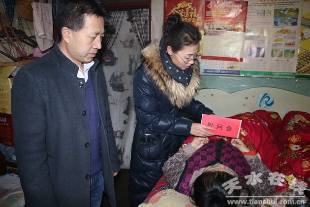 在残疾人吴毓琴家家中,街道主任姚国英与老人拉家常、问冷暖,亲切交谈,详细询问了他们的身体情况及家庭状况,并将300元现金和米面油等生活用品带给了他们,并祝愿他们过一个祥和的春节。