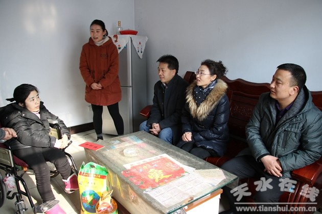 在新春佳节即将来临之际,为让社区残疾人体会到政府和社会的关怀、关爱,能够度过一个祥和、温暖的春节,1月25日上午,天水郡街道办事处主任姚国英、街道武装部长马韬带领社区干部分别走访慰问了皂郊路社区2户特困残疾人家庭,为他们送上节日祝福、慰问品和慰问金。