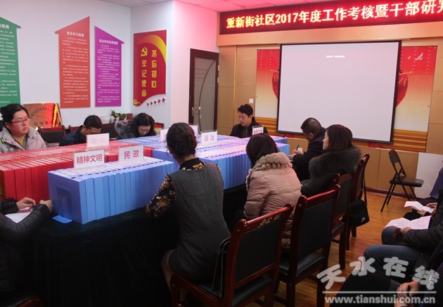 首先,社区书记代表社区班子对社区一年来的工作进行了总结汇报,并进行了述职述廉。考评组成员向与会人员发放了社区领导班子和干部民主测评表,现场对社区建设以及社区领导干部从德、能、勤、绩等方面进行民主测评。同时,考核组对社区工作人员进行了个别谈话,询问了社区工作人员对社区领导班子及成员的意见和建议,作为评先选优的重要依据,以此来激发社区工作人员的工作积极性,更好的服务居民。其次,考核组成员现场查阅了各项工作的相关资料台账,对照目标责任书的完成情况进行了量化打分。 最后,考核组对考核情况进行点评,明确指出缺项和不足,提出整改要求。