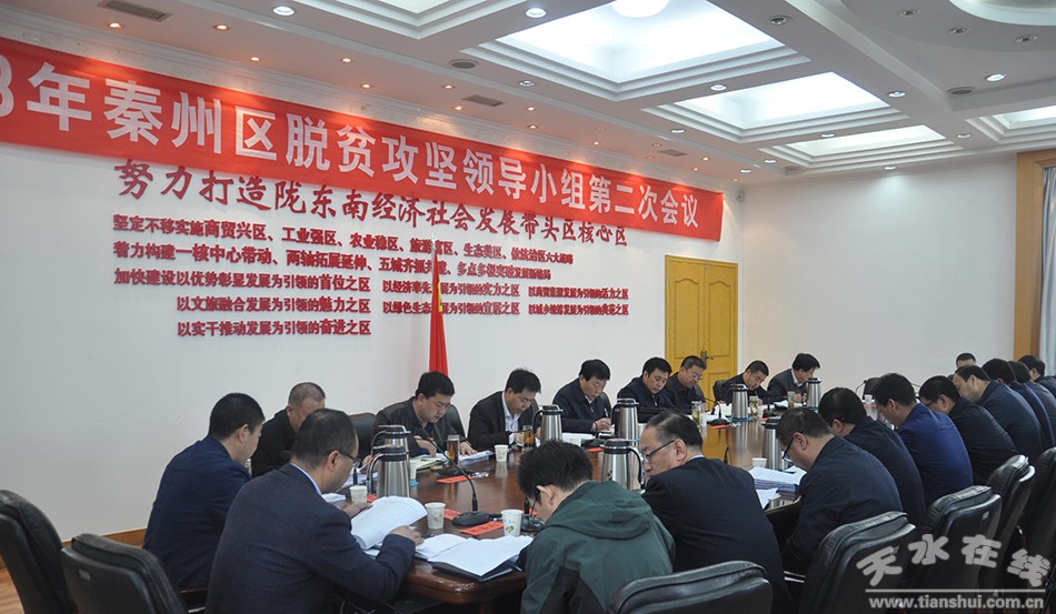 秦州区外宣办3月13日讯(赵锋)12日,秦州区召开2018年脱贫攻坚领导小组第二次会议。市委常委、秦州区委书记雷鸣出席会议并强调,在农业农村和脱贫攻坚工作中肯定经验,在三年脱贫攻坚提升工程中寻找短板,在如期完成脱贫攻坚任务中健全考核、问责、奖惩机制,确保全区脱贫攻坚工作扎实推进、按期完成。区委副书记、区长刘文玺主持会议