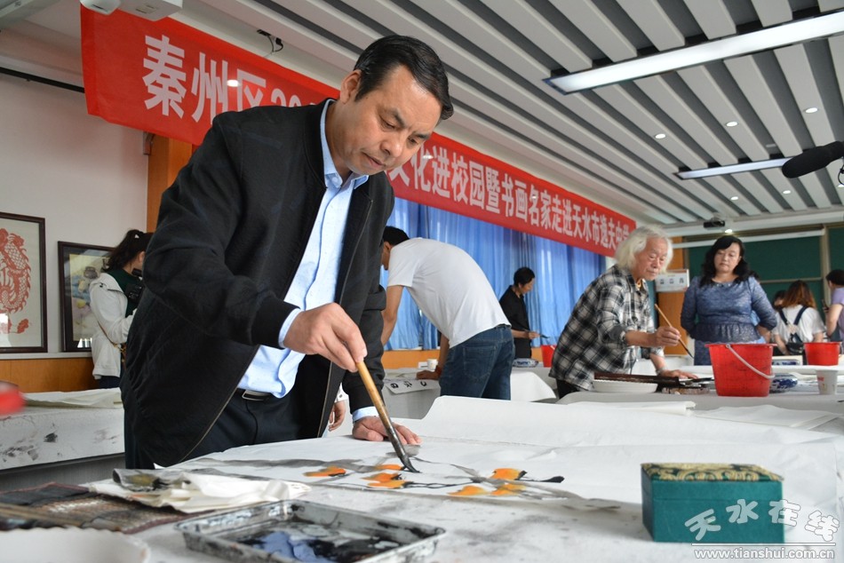 天水市人大原主任、天水市关工委主任李世荣,天水市人大原副主任、天水市教育委员会主任、天水市关工委学校委员会主任杨兴胜,天水市地税局原局长,天水市关工作委学校委员会副主任康启瑞,秦州区人大原主任、秦州区关工委常务副主任杨虎林,秦州区政府副区长罗增芳,天水市教育局副局长、天水市逸夫实验中学校长沈建玲,秦州区人大原副主任、秦州区关工委副主任于学武,秦州区人大原副主任、秦州区关工委副主任刘怀顺,天水师院美术学院原院长、天水市美协原主席张玉璧,天水市教育局体艺科科长何安营,秦州区文广局局长秦毅敏,天水市美协副主席、秦州区文化馆馆长赵晖,天水市逸夫实验中学党支部书记周和平,副校长周旭忠、计卫珍、花明等领导及天水民俗专家、文化学者李子伟、吴治中、彭有权,书画家杨荫浓、陈安祥、高全生、刘强、马春林、苏东有、金海林、张国锐,非遗代表性传承人、天水工匠赵旭辉、李亮、吴玉华、白海燕,秦腔表演艺术家田芳,天水66号文化创意园董事长刘晓武等参加了本次活动。