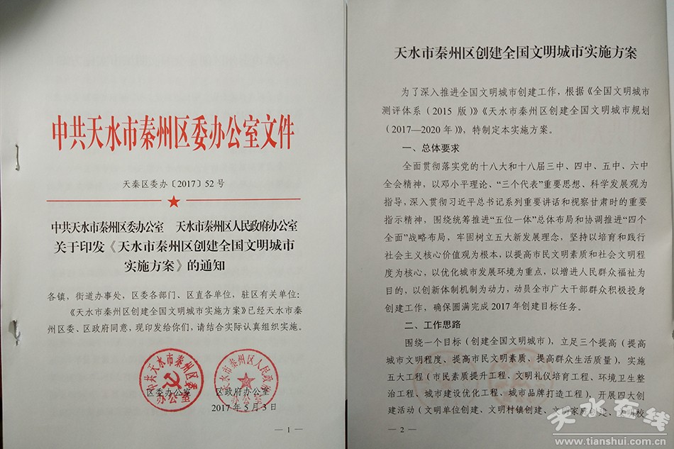 该区坚持把创建全国文明城市工作列入全区重要议事日程,定期召开联席工作会议,紧紧围绕创建目标和定量指标,专题研究,及时解决创建过程中出现的矛盾和问题,对照《全国文明城市测评体系》各项标准,根据《天水市创建全国文明城市规划》和《天水市创建全国文明城市实施方案》,结合秦州实际,制定了秦州区《创建规划》和《实施方案》,将创建工作纳入年终目标责任考核,全面推行网格化管理、清单式量化,重点督查、动态督导、跟踪问效,确保创建全国文明城市工作有力有序推进。