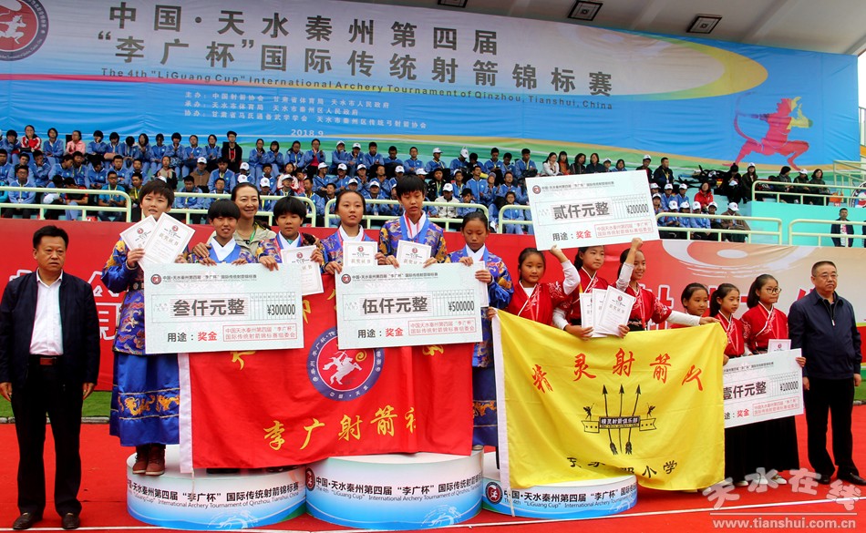 西北名族大学体育学院院长刘可,秦州区人大常委会主任文月平为秦州区天水郡小学代表队等获得现代传统弓少年组男子团体前四名的代表队颁发了获奖证书和奖金。