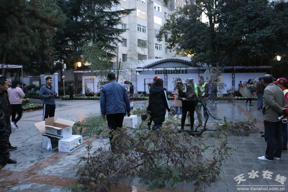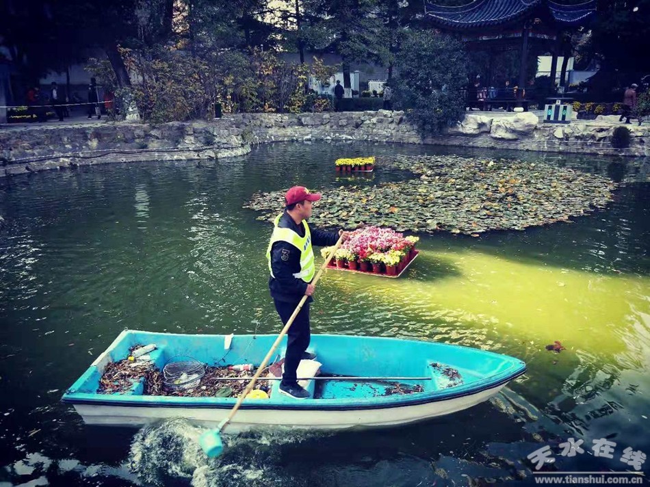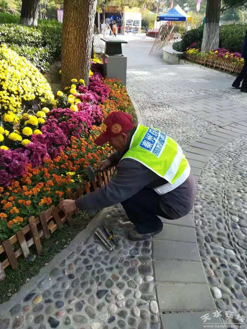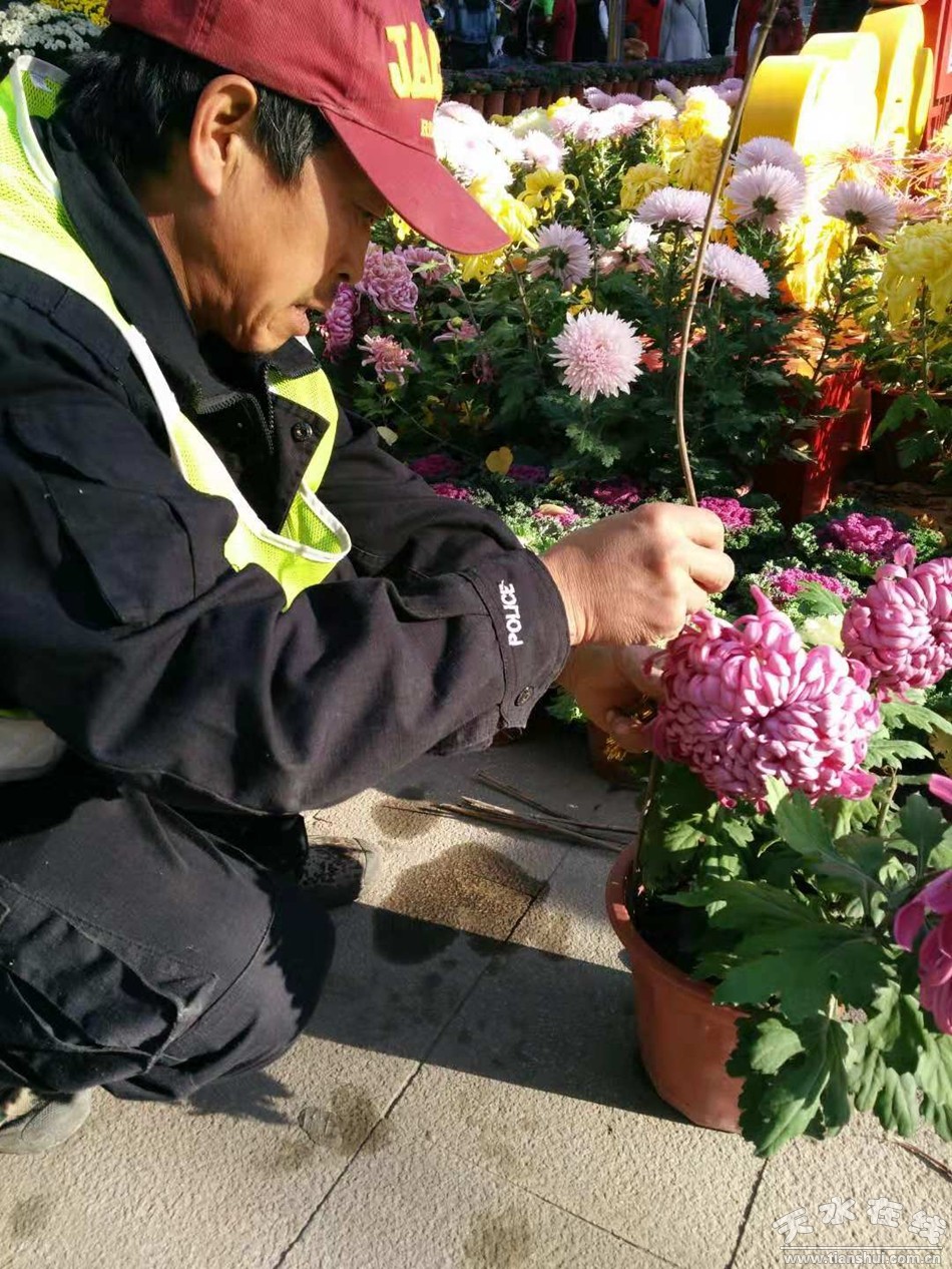 菊展期间,为了提供文明和谐的游园环境,园林职工每天都要对5万余盆的花卉进行日常养护、湖面垃圾清理、花艺区的整理修护、花卉更换,并提供服务咨询、菊展介绍。为保障安全的游园环境,设置安全警戒线,疏导游人,专门设置视频监控系统,由专人进行管理,进一步加强24小时值班制度,特别是夜间安保及管理等相关工作。在中山亭设置挥毫泼墨的场所,每天为市民赠送书画作品,安排专人进行诗词朗诵,让菊花的馨香走进每一个市民的生活,让菊花绚丽多姿的色彩扮靓秦州的秋天。
