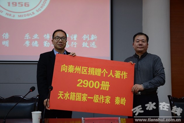 会议期间,还举行了秦岭先生个人着作捐赠仪式。秦岭先生将自己创作的天水题材的书籍共计11种2900册捐赠给秦州区,这些书随后将分别送到区图书馆、全区各中小学、各镇、街道文化站、社区书屋以及有关文化单位,供全民阅读。