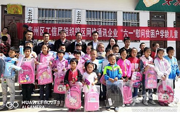 6月1日,秦州区工业和信息化局组织辖区内中国移动天水分公司、中国电信天水分公司、中国铁塔股份有限公司天水分公司、甘肃省广播电视网络股份有限公司天水分公司、中国联通天水分公司五家网络通信爱心企业,筹集资金5000余元,深入秦州区天水镇苏寨村,开展“六·一”儿童节走访慰问贫困户学龄儿童活动。活动期间,辖区内五家网络通信企业主要负责人对40名来自贫困户家庭学生进行了慰问,给学生们送上了书包、笔盒等慰问品,通过走访慰问活动的开展,通信企业不仅全面了解了贫困儿童的学习及生活状况,也为孩子们带去了党和政府的温暖与社会的关怀,增强了贫困户脱贫致富的信心和决心。