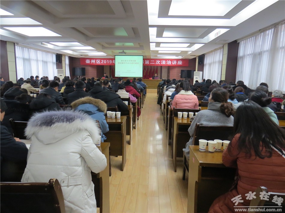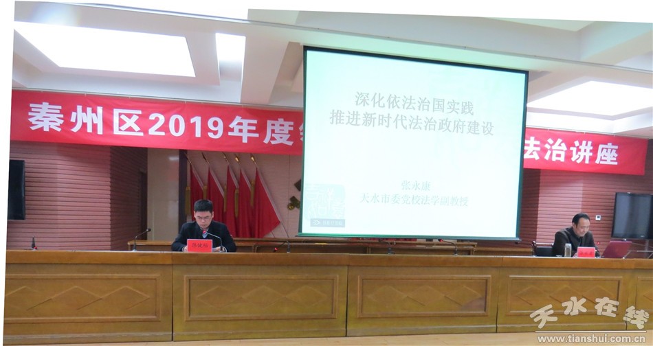 秦州区融媒体中心12月19日讯 为全面提高领导干部法治思维和依法行政能力,12月14日,秦州区举办2019年度第二期全区领导干部法治专题讲座。邀请天水市委党校法学副教授张永康作了题为《深化依法治国实践 推进新时代法治政府建设》的专题辅导报告。