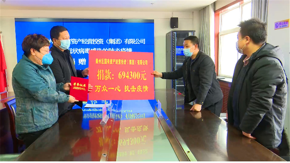 秦州区融媒体中心2月20日讯(记者 杨文慧)2月18日,秦州区国投公司代表爱心企业,为秦州区红十字会捐款捐物,用于支持秦州区疫情防控工作。据了解,疫情防控工作开展以来,区国投公司积极倡议企业捐款捐物,51家企业及7名个人捐款69.43万元。同时还捐赠了84消毒液、酒精等防疫物资。(编辑 张敏)