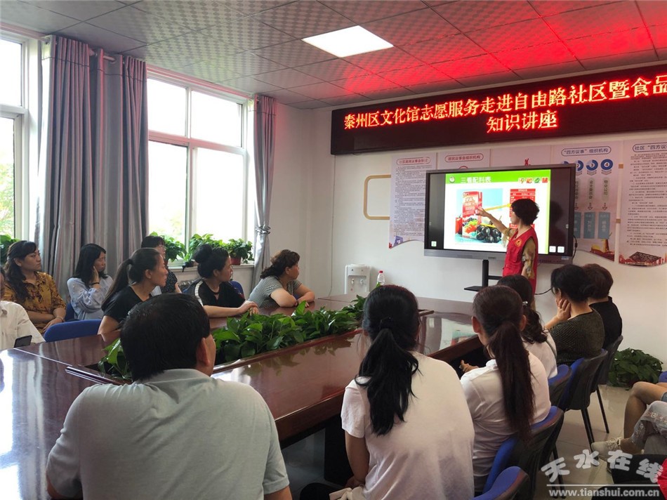 活动中,工作人员及文化志愿者在名城保护传承人的带领下,来到西关古民居保护院落,了解天水历史名人飞将军李广事迹、荣氏福新天水办事处发展历程和传统文化院落建筑风貌,重温历史记忆,感知传统文化。随后,在自由路社区还举办了“小标签大学问”食品安全和营养知识讲座,讲座围绕食品标签的认识、食品安全知识以及日常生活中的食品不安全因素等,为社区居民进行了详细讲解,进一步提高了居民对安全食品的鉴别能力,引导大家在今后的生活中注意合理膳食,形成自主自律、勤俭节约的良好行为。