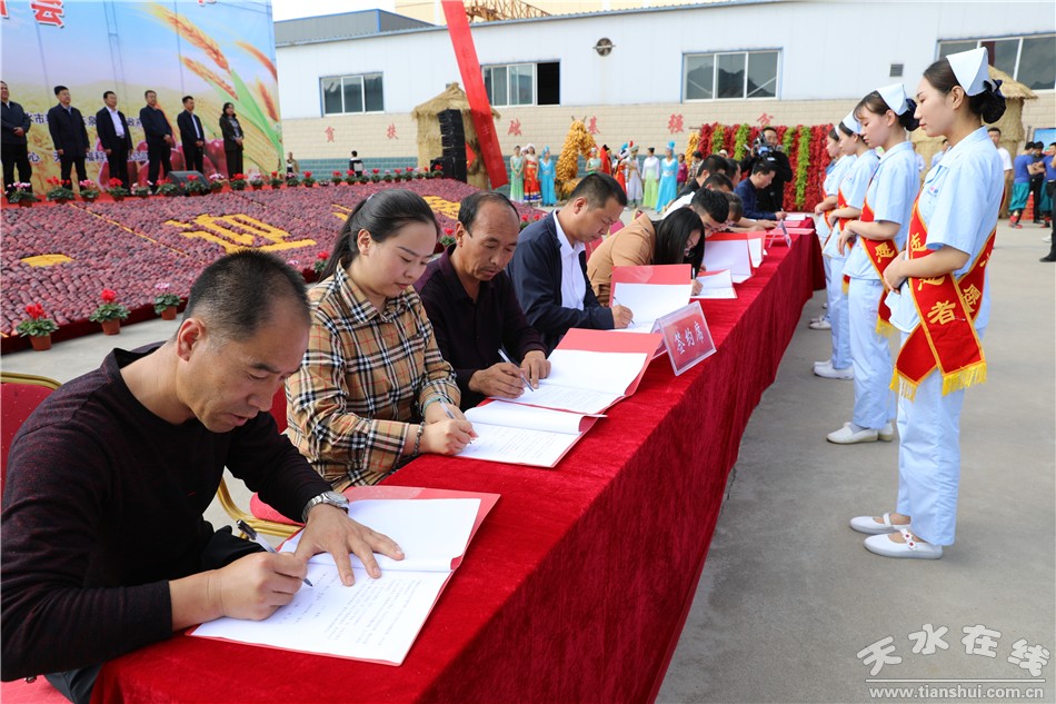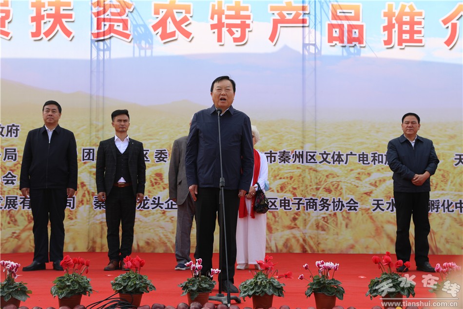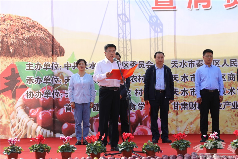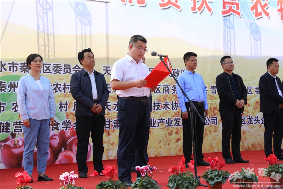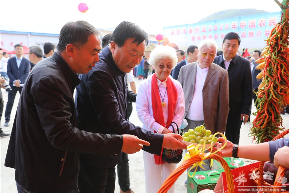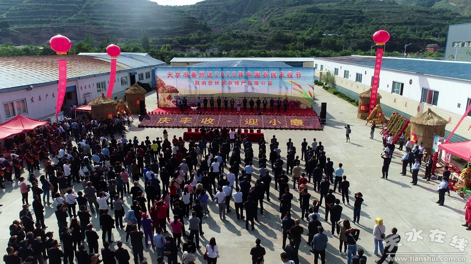雷鸣宣布天水市秦州区庆祝2020年中国农民丰收节暨消费扶贫农特产品推介活动启动!区委副书记裴贵军主持启动仪式,市科协主席李凤奇,市商务局党组副书记李晓东,市农业农村局副局长赵多长,共青团天水市委副书记赵强,区领导王永刚、张恒刚、刘书文、兰雪艳、郭金霞及消费扶贫成员单位、16镇负责人,全国营养师、龙头企业、合作社、消费扶贫签约代表,“十佳”农民及群众代表共1000余人参加活动。