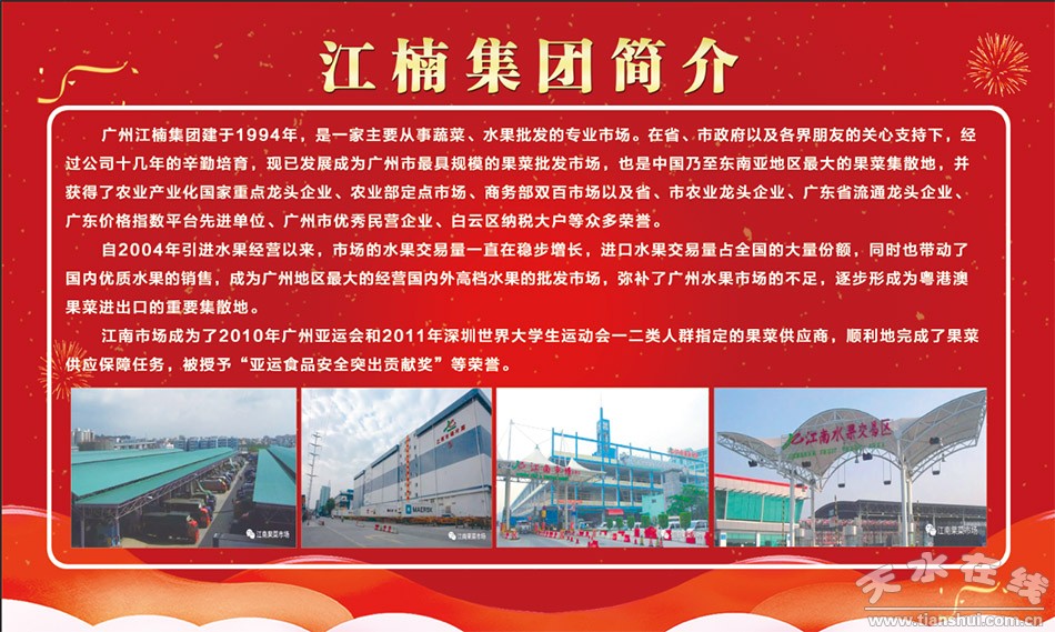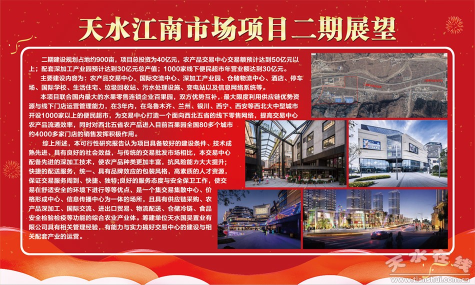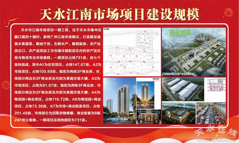据了解,2019年7月,江楠集团与秦州区政府在第25届兰洽会重大项目签约仪式上签署了《天水江南市场项目框架协议》,开启了江楠集团以甘肃天水为“战略支点”。天水秦州江南市场项目总规划面积1067亩,分两期建设,将建设涵盖水果蔬菜、粮油干货、生鲜水产、糖酒副食、农产品进出口、农产品深加工与仓储冷链配送在内的农产品交易与物流专业市场和基地集群,并设立农产品大数据中心、电商孵化中心、检测溯源中心、大型停车场、冷藏库、制冰车间、酒店、商业街、休闲中心、生活小区等配套服务设施。项目建成后,将极大地带动商贸物流业的飞速发展,直接带动地方农业种养殖、食品加工、物流贸易等一二三产业的发展。