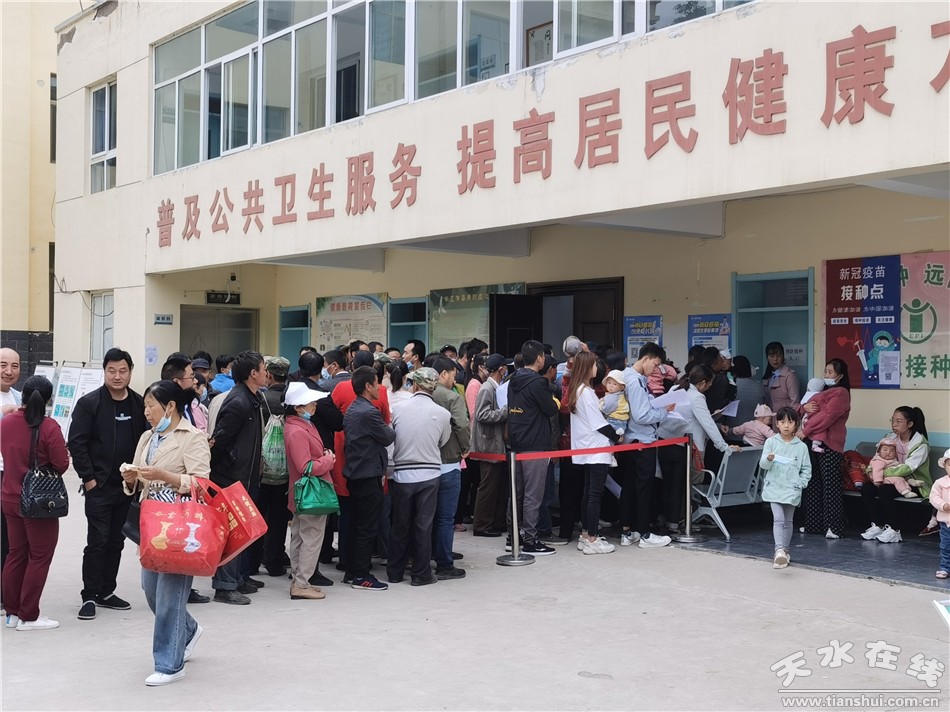 在太京镇、天水镇、平南镇等地卫生院人们排着长队有序等待接种疫苗,为确保群众及时接种,卫生院人员加班加点,严格按照疫苗接种“三查七对一验证”流程规范接种新冠病毒疫苗。
