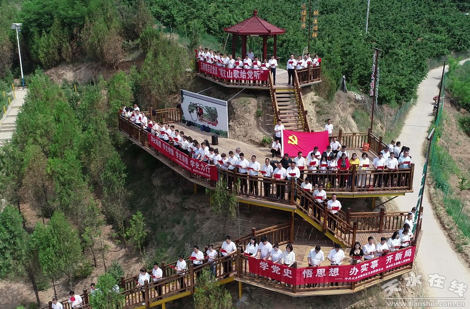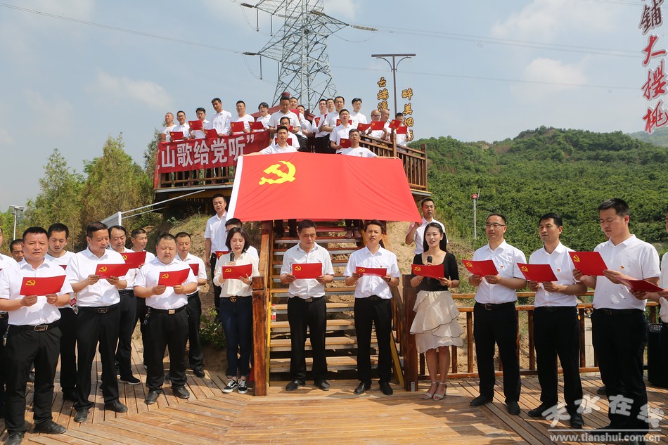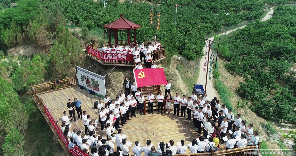 (镇村干部200余人激情满怀,齐声高歌《唱支山歌给党听》。)