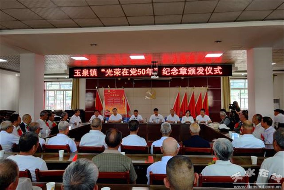 6月21日,玉泉镇举行“光荣在党50年”纪念章颁发仪式,向32位老党员颁发了纪念章,并合影留念。现场,党员干部共同重温入党誓词。