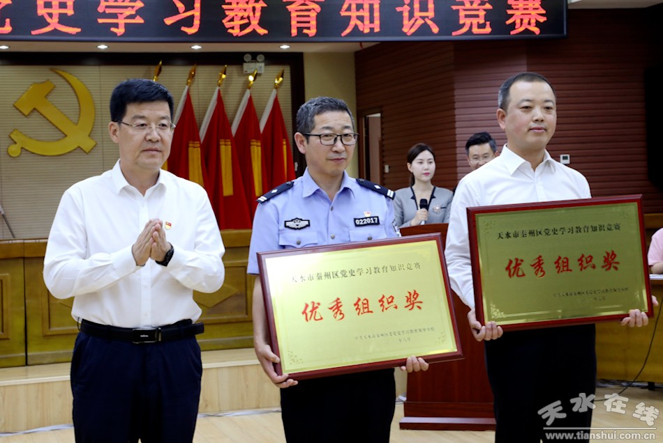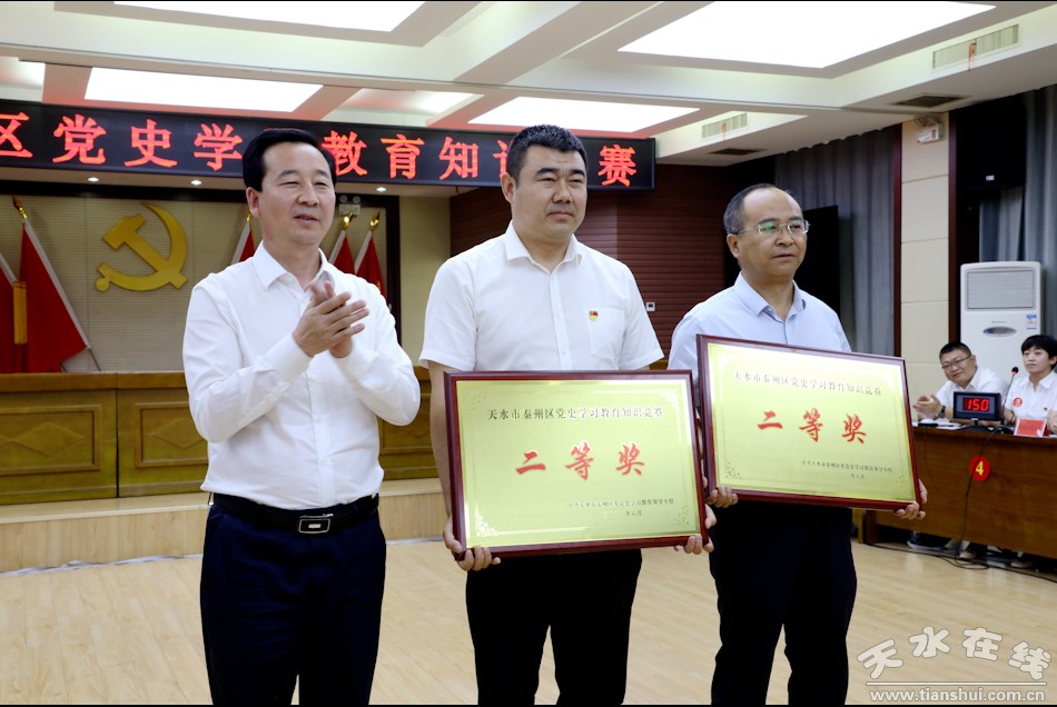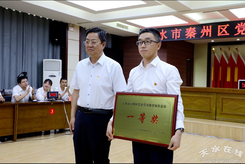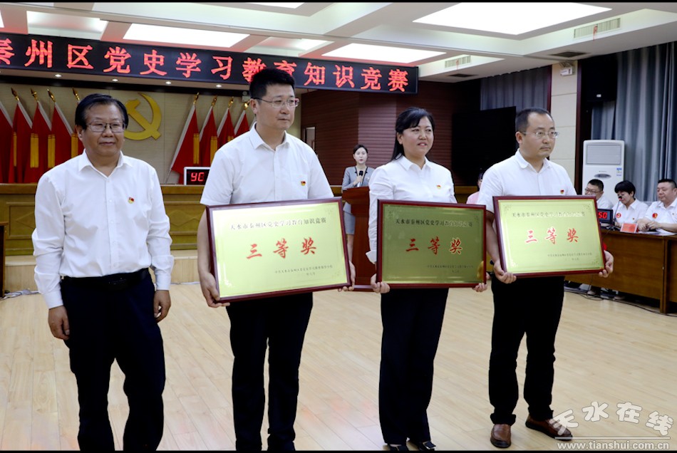 秦州区融媒体中心6月25日讯(记者 杨旭 邵千)6月25日,秦州区举办党史学习教育知识竞赛,市委常委、区委书记王东红,区委副书记、区长孟晓龙,区人大常委会主任魏胜奎,区政协主席毛更生观看比赛并为获奖队伍颁奖。