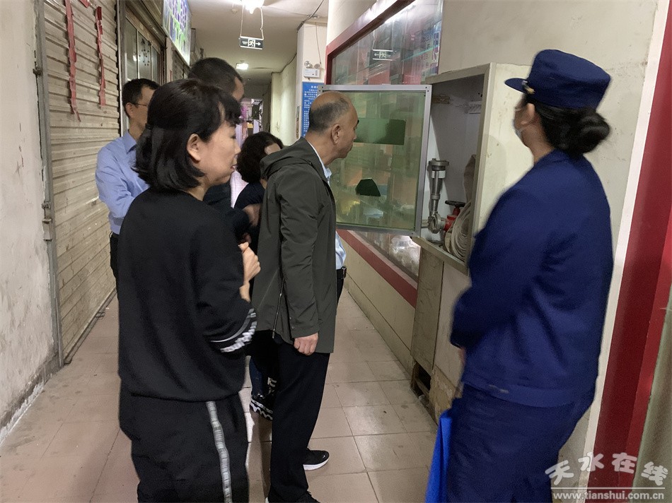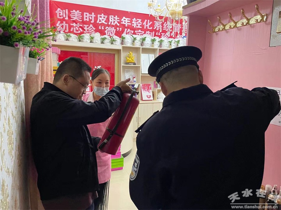 日前,天水郡街道开展安全生产大检查活动。活动中,街道工作人员深入辖区内的小区、沿街商铺等重点区域,仔细查看了安全出口和疏散通道、灭火器等,并对检查中发现的安全隐患现场进行了告知,要求他们压实安全生产责任,做好消防,安全防范工作。