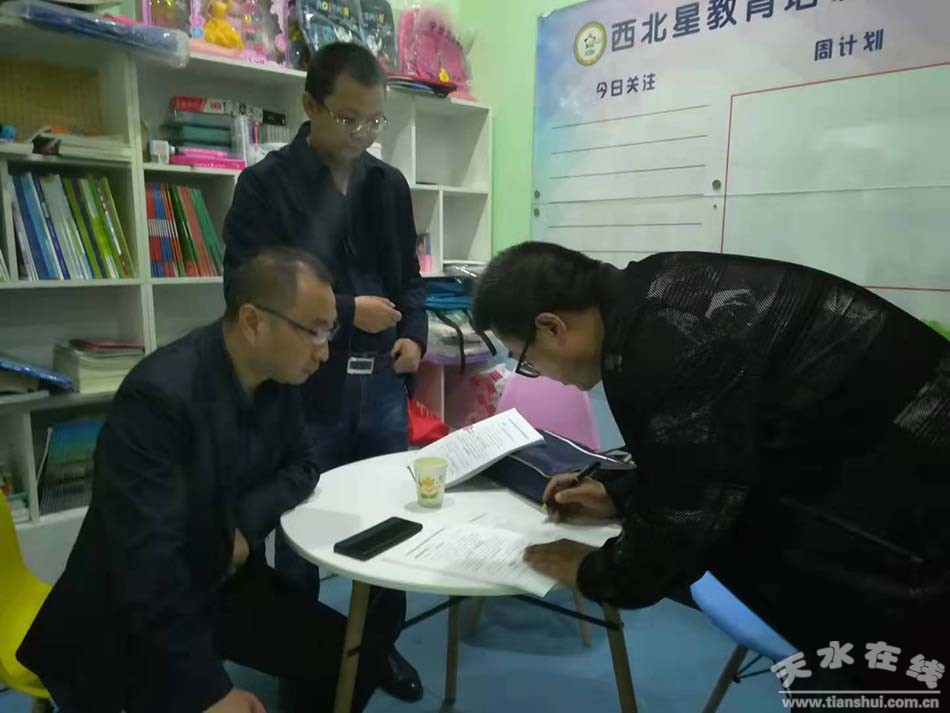 秦州区融媒体中心10月5日讯 (记者刘武锋)为贯彻落实“双减”政策,切实减轻中小学生课外负担,全面规范校外培训机构经营管理,国庆期间,秦州区教育局联合公安、市场监管、应急管理、消防大队、综合执法等相关部门组成联合执法组,通过明察暗访的形式对全区校外培训机构进行为期3天的专项整治。
