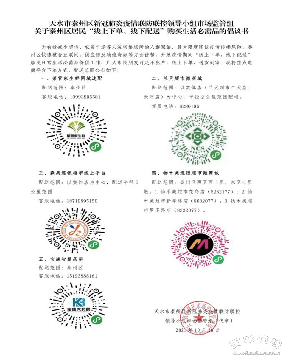 秦州区融媒体中心10月29日讯 针对当前疫情防控严峻形势,秦州区市场监管局强化市场监管领域疫情防控工作,坚决维护市场经营秩序,严厉打击扰乱市场经营秩序的违法违规行为,每日固定监测民生商品、口罩、酒精、84消毒水等防疫物资及超市、零售店销售的米、面、油、蔬菜、肉、蛋、奶等27种商品的当天售价。为有效减少超市、农贸市场等人流密集场所的人群聚集,区市场监管局充分发挥监管优势,整合互联网、供应链及物流资源等方面资源,联系相关经营单位开展疫情期间“线上下单,线下配送”居民日常生活必需品保供工作,并及时印发关于秦州区居民“线上下单、线下配送”购买生活必需品的倡议书,提示广大居民利用电商平台购买生活用品,全力维护人民群众身体健康和生命安全。(供稿 区市场监管局/编辑 靳艳艳 审核 辛智翔)