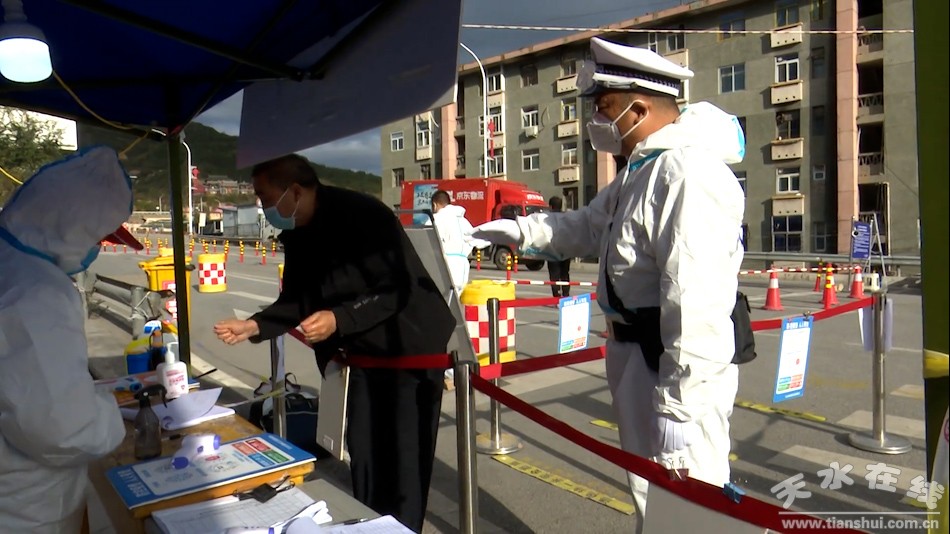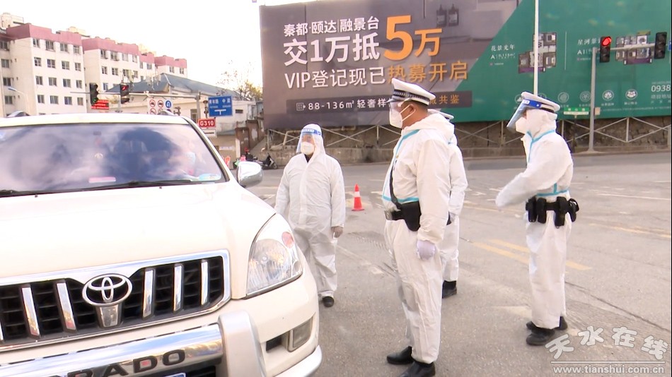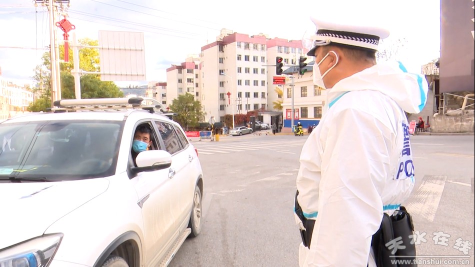 在秦州区泰山北路左家场出入口卡口,喇叭里传来一阵阵劝导声。自疫情防控以来,城区交警大队二中队守护着秦州北大门。这里是交通要道,过境车辆和人员较多,管控任务重。中队长何维春每日在卡点巡逻,对过往车辆和人员严格盘查,当好守门带头人。