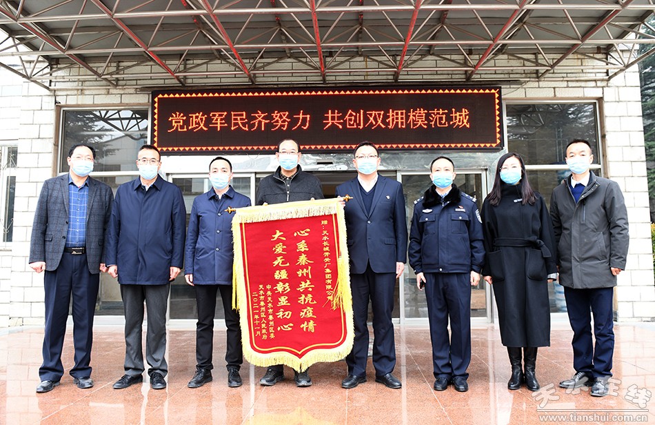 秦州区融媒体中心11月26日讯(记者 丁红妮)11月26日,秦州区委常委、政法委书记何炜巍,区政府副区长候选人惠斌带领区商务局、卫健局、工信局、秦州公安分局等单位相关负责人来到天水长城开关厂集团有限公司,将印有“心系秦州共抗疫情 大爱无疆彰显初心”的锦旗送到公司负责人手中,对该企业在疫情防控期间的积极作为表示感谢。