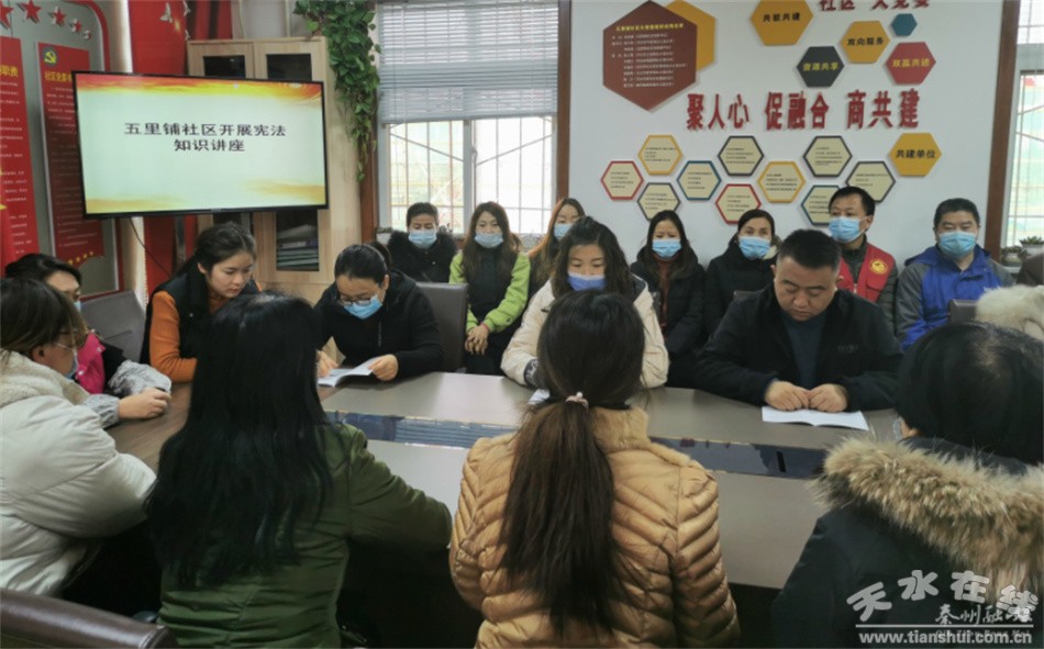 五里铺社区组织党员干部和居民群众30余人开展“宪法进社区”知识讲座。讲座中,社区党委书记为参加讲座的党员干部、居民群众讲述了《宪法》的有关知识,大家在认真听讲的同时,更深刻地理解了法治文化、法治理念、社会主义核心价值观的深刻含义。社区工作人员还向居民发放了法治宣传手册,引导居民理性表达利益诉求,增强普法教育的吸引力。