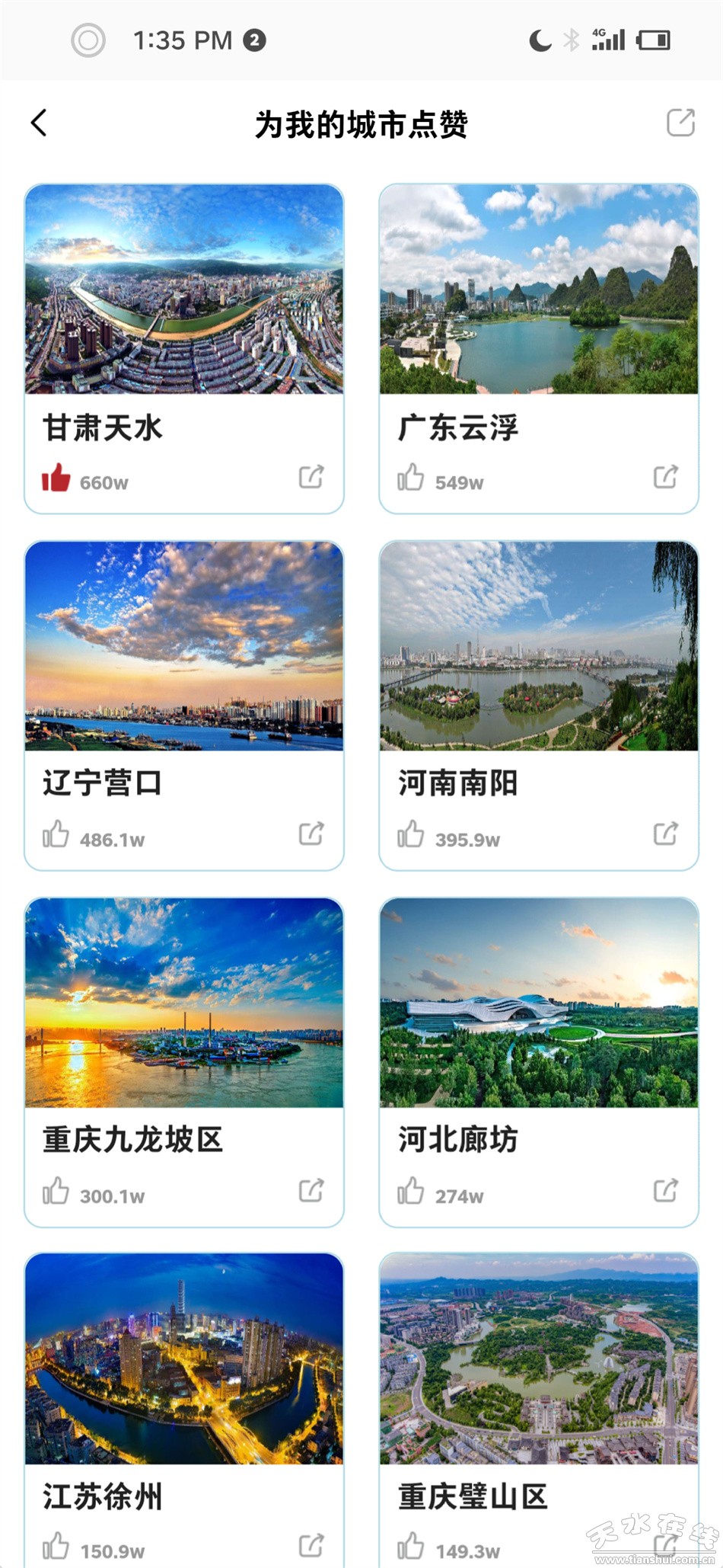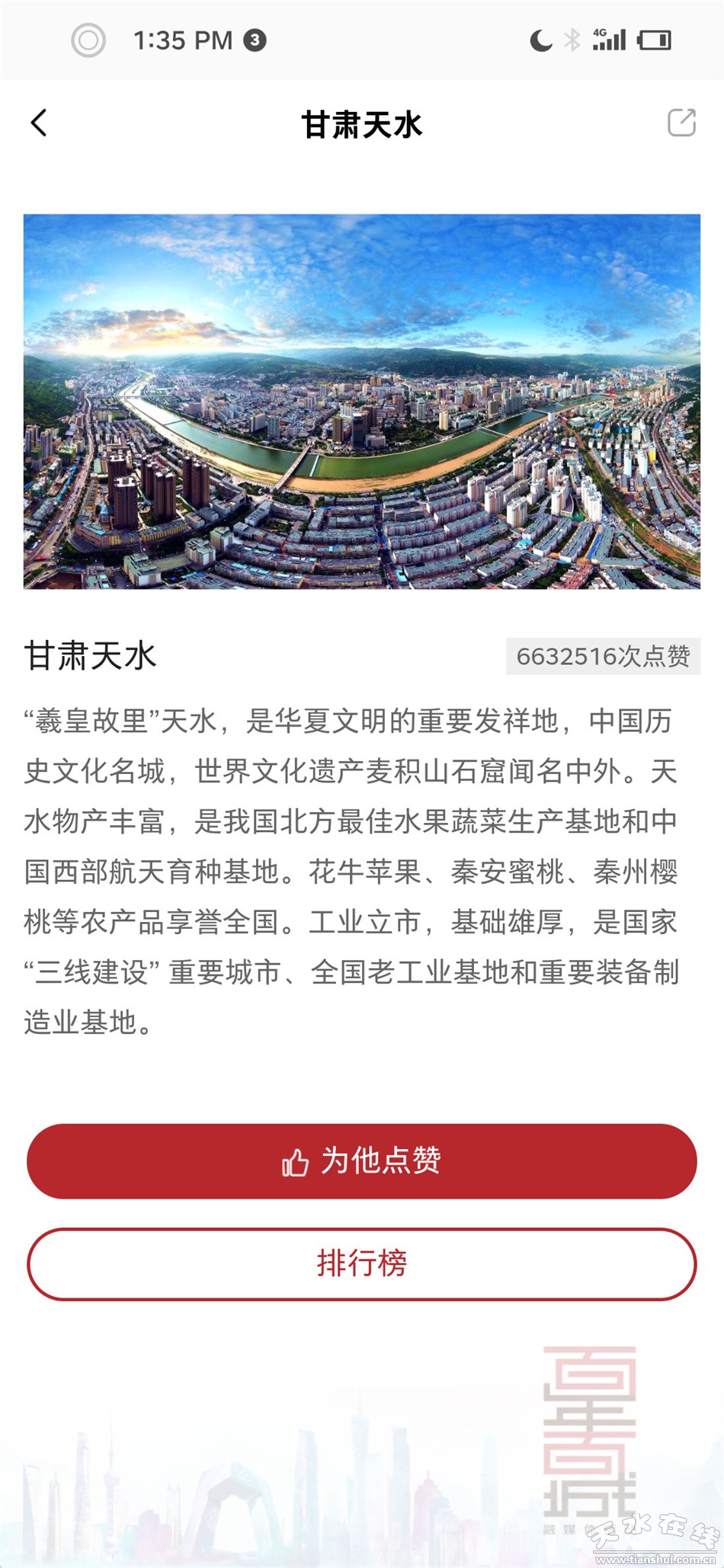 自中央广播电视总台财经节目中心特别推出《百年百城》融媒体活动以来,每天打开手机随手为家乡点赞投票,向外地的亲朋好友们展示天水近几年的发展变化成为很多市民的日常。虽然距节目播出已经过去了一段时间,但我区市民的点赞热情不减,在大家的齐心助力下,目前天水的点赞量已经达到了660万,在参与活动的全国100座城市中位居首位。