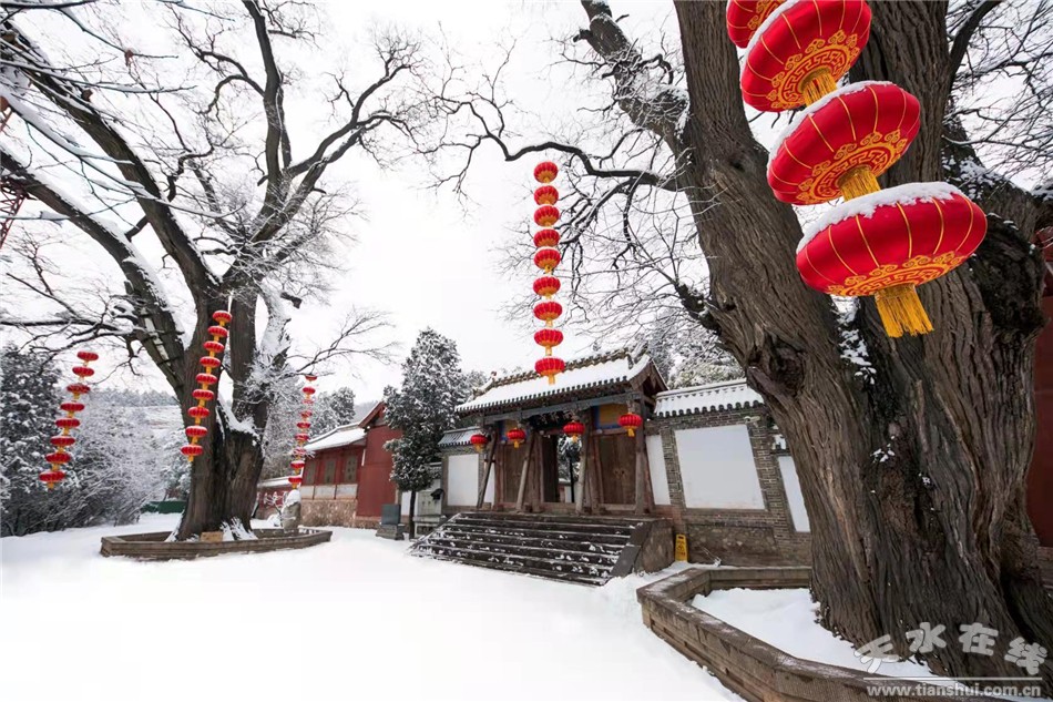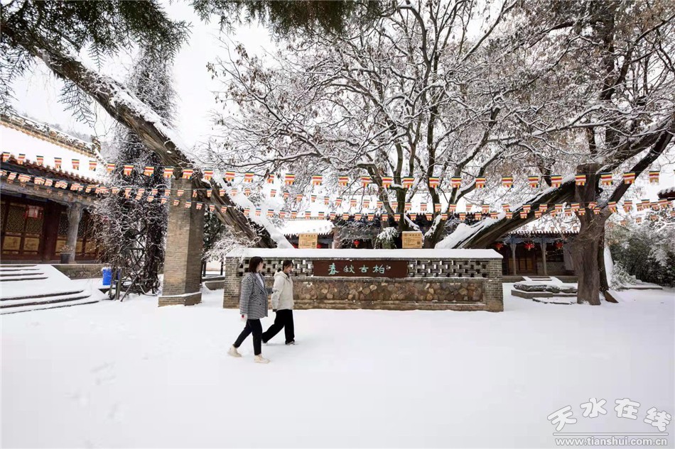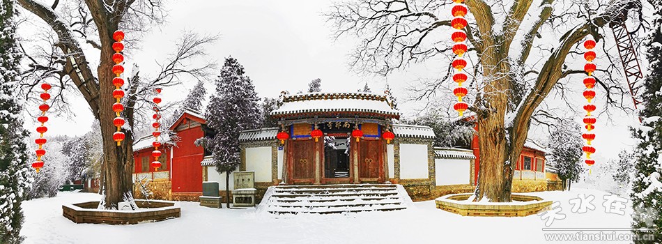 春秋古柏:位于西院正中偏西。此即杜诗中所称的“老树”,树龄2300—2500年,虽老态龙钟,但枝青叶翠,生机盎然。被誉为中国古树“活化石”,自古被列为“秦州八景”之一。