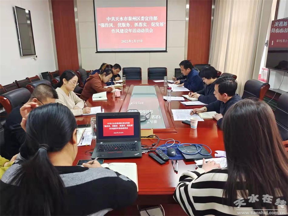 秦州区融媒体中心2月28日讯 日前,区委宣传部组织召开“强作风、优服务、抓落实、促发展”作风建设年活动动员会议,传达学习全区“强作风、优服务、抓落实、促发展”作风建设年活动动员大会精神,安排部署了区委宣传部作风建设年活动。区委常委、宣传部部长胡小云作动员讲话。