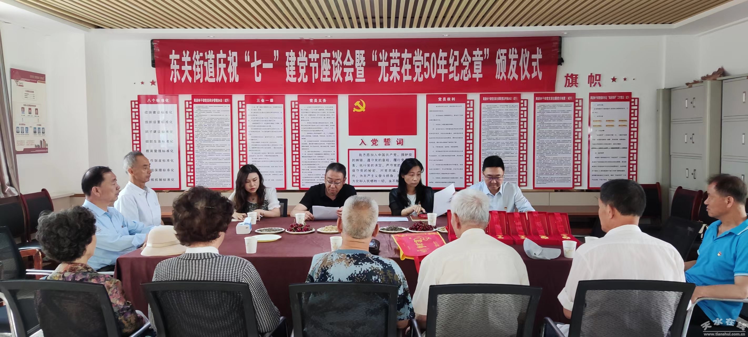 6月24日,东关街道召开庆祝“七一”建党节座谈会暨“光荣在党50年纪念章”颁发仪式。仪式上,为六位党员颁发了纪念章,所有党员面对党旗重温了入党誓词。几位老党员纷纷追忆起自己的入党初心,从自身的工作经历、生活变化谈了谈祖国的发展。他们表示要发挥党员的先锋模范作用,为党的伟大事业,为国家富强、民族振兴奉献一份自己的力量。