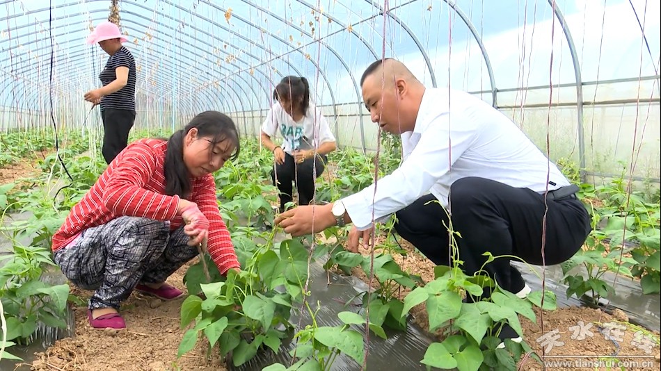 在王沟村党支部领办的集体经济发展产业示范园的蔬菜大棚里,区、镇人大代表王中锋在给来大棚里务工的村民指导豆角搭架。作为大门镇人大代表之家产业发展代表专业小组成员,王中锋在得知王沟村村民想盘活村集体资源,发展设施蔬菜产业后,及时与代表之家专业小组成员进行调研论证,最终提出由村集体股份经济合作组织承租王沟村撂荒的45座蔬菜大棚的建议。