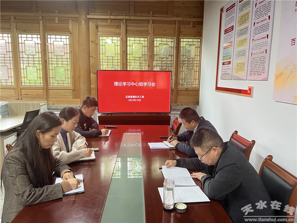 秦州区委直属机关工委召开理论学习中心组学习会议,专题学习党的二十大精神。会议强调,全体党员干部要切实提高思想认识,把学习宣传贯彻党的二十大精神作为当前和今后一个时期重要的政治任务,使二十大精神在基层党建工作中落地生根。要做到读原著、学原文、悟原理,使大会精神入脑入心,武装头脑、指导实践、推动工作。要联系机关党建工作实际,紧紧围绕党中央和省、市、区委决策部署,紧扣自身工作职责,深刻领会大会提出的新思想新论断新要求,特别是关于党的建设、全面从严治党、党风廉政建设等重要论述、重要要求,落实到工作中、体现到行动上。要继续推进新时代党的建设新的伟大工程,坚定不移推进党风廉政建设,践行党的宗旨,勇于担当作为,努力为机关党建工作高质量发展作出更大贡献,把学习党的二十大精神激发的精气神转化为推动机关党建高质量发展的实际成效,转化为民服务的强大精神动力。
