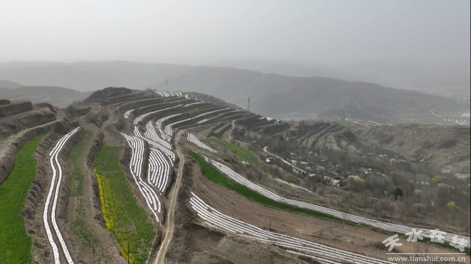4月11日,记者在天水镇李尧大豆玉米带状复合种植基地看地,李尧村的百亩大豆玉米复合种植覆膜工作已全面完成,像一条条玉带,缠绕在半山腰。