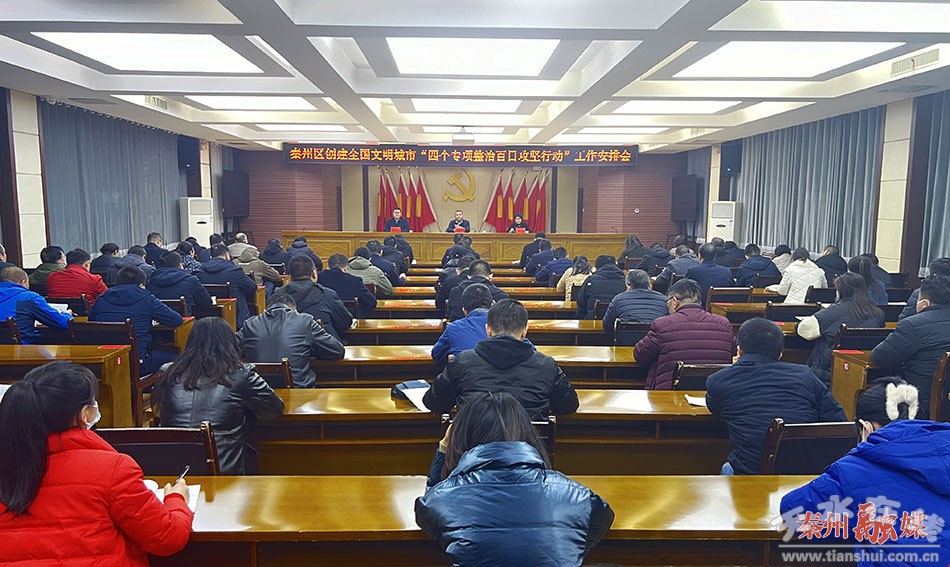 秦州区融媒体中心12月13日讯 (记者 王歧)12月12日,秦州区召开创建全国文明城市“四个专项整治百日攻坚行动”工作安排会,对交通秩序专项整治工作和基础设施建设专项整治工作进行安排部署。区委常委、常务副区长李东海,区委常委、宣传部部长胡小云,副区长田小红出席会议。