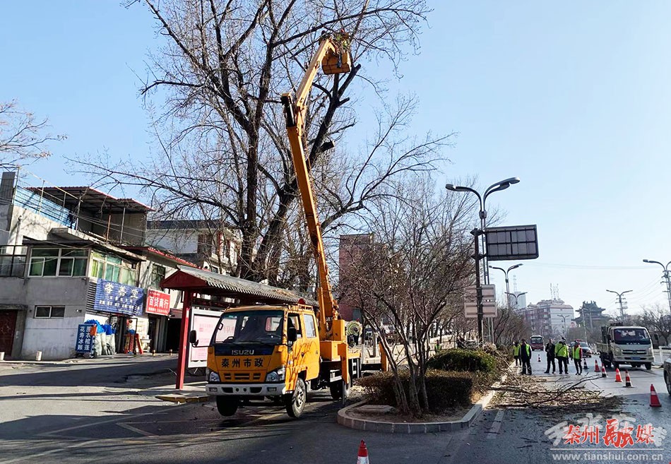 在聚宝盆附近,伴随着轰隆隆的机械声,工作人员正在对存在安全隐患的树枝进行修剪作业。进入冬季以来,秦州区园林建设服务中心按照“因树修剪、因型修剪”的作业标准,对市区道路两旁的乔灌木以及存在一定安全隐患的树木进行全面整形修剪,积极开展冬季苗木养护工作。