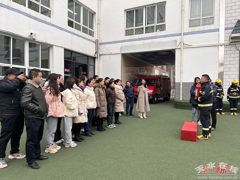 培训会上,秦州区消防救援大队消防员通过典型案例,向师生们讲解了火灾发生的原因、预防措施、火场自救方法及灭火器的正确使用等相关知识,并现场进行了操作演示。