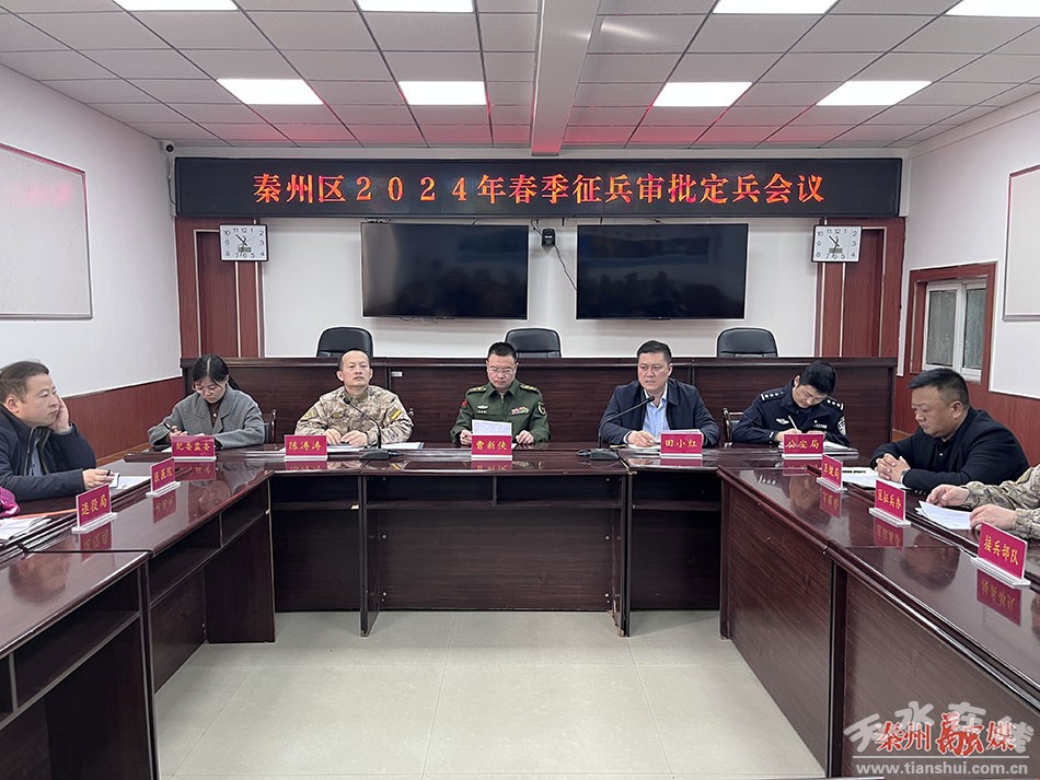 秦州区融媒体中心3月11日讯 3月11日,秦州区2024年春季征兵审批定兵会议召开,天水军分区领导曹新侠,区委常委、区人武部领导陈涛涛,副区长田小红出席会议。