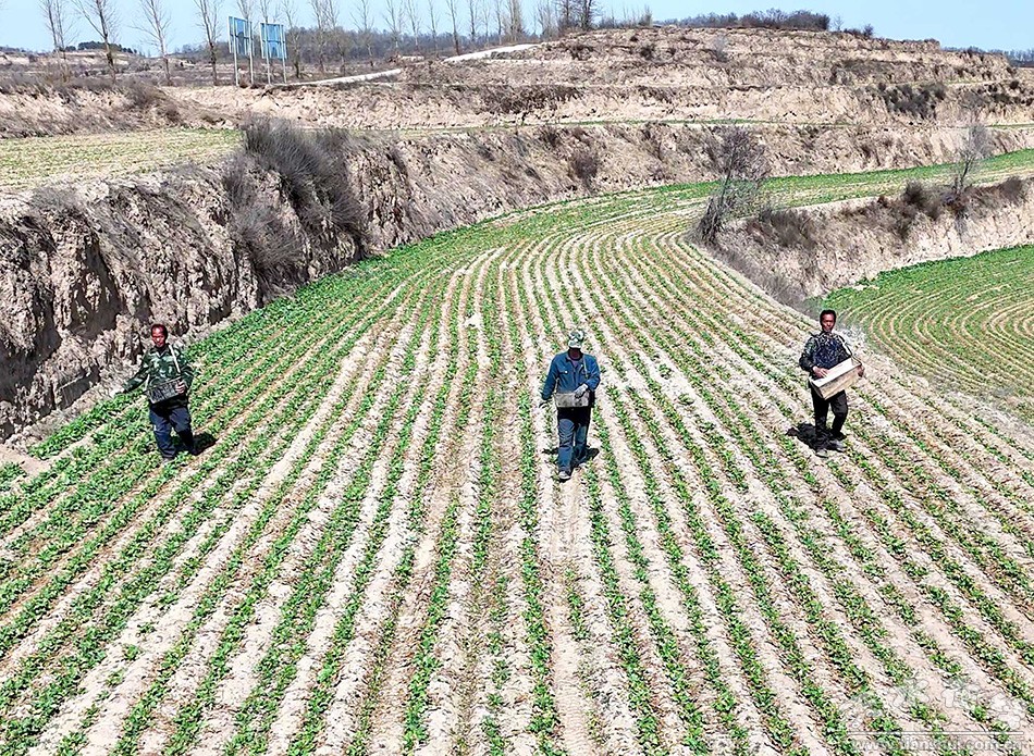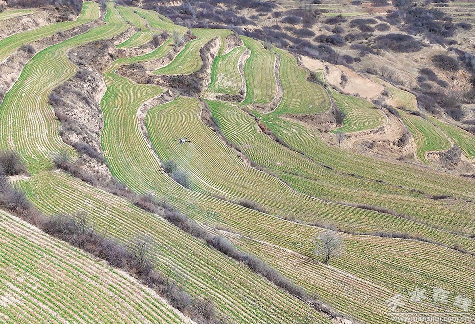 春分时节,气温回升,秦州区种植的50.7万亩冬小麦和冬油菜陆续返青,正是病虫害防治和施肥促壮的关键期。在杨家寺镇东山梁万亩粮油示范片带,丰汇种植合作社工作人员正在农技人员的指导下,利用植保无人机对400余亩冬油菜开展飞防作业,并组织农户对返青小麦进行施肥。