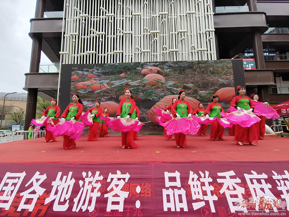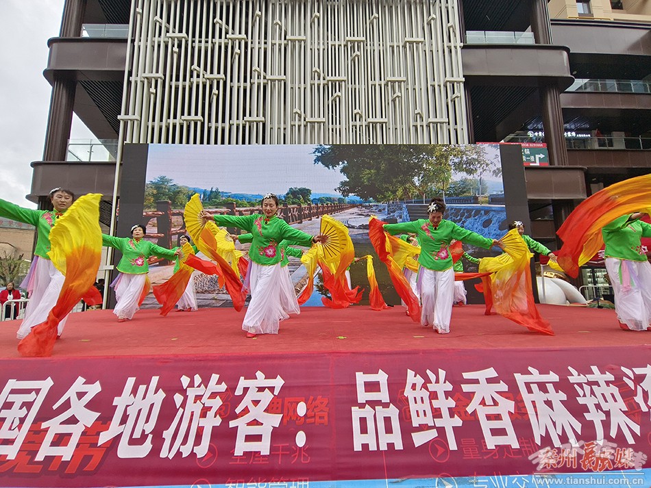 演出在广场舞《五星红旗》中拉开帷幕。独唱《中国人》、秦腔《下河东》、秦州小曲《绣荷包》《拉骆驼》、皮影戏、广场舞《欢聚一堂》《花开中国》等形式多样的节目轮番上演,给市民和游客带来了一场别开生面、乡味浓厚的“文化套餐”。