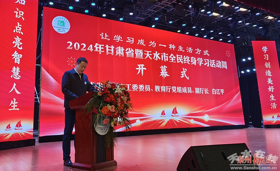 秦州区融媒体中心4月10日讯(记者 崔磊) 4月9日,由甘肃省教育厅、天水市政府主办的2024年甘肃省暨天水市全民终身学习活动周开幕式在甘肃机电职业技术学院举行。中国成人教育协会副会长崔邦焱,国家开放大学、国家老年大学党委副书记、纪委书记刘璇璇,甘肃省教育厅党组成员、副厅长白江平,甘肃省职业与成人教育协会会长时宁国出席开幕式。副市长汪小娟出席开幕式并致辞,区委常委、宣传部部长胡小云参加开幕式。