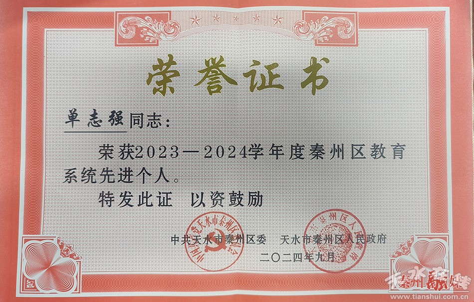 单志强始终把自己的一腔热血和全部精力投入到教育事业中,凭借扎实的工作作风和出色的工作成绩,先后被评为优秀党员、优秀教师、优秀班主任,并荣获秦州区初中优质课一等奖等荣誉。