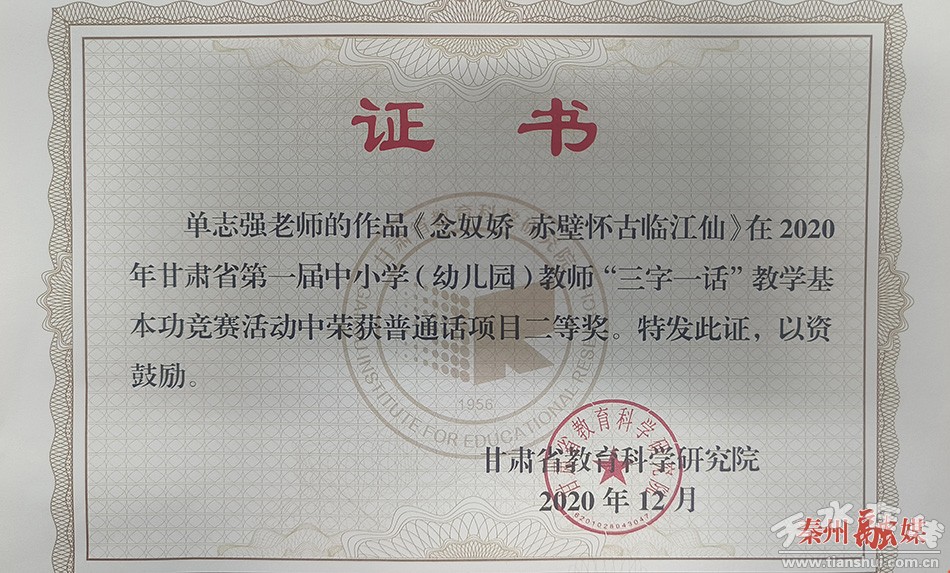 “能够严于律己,以教好书、育好人为己任,尊崇党的教育事业,同时,他以饱满的热情、求真务实的工作态度,能够圆满地完成学校交办的各项任务,而且他的学生特别爱他,能够做到有温度,爱学生,在学校受到我们领导和同事的一致好评,也得到学生家长和社会的广泛认可。”天水市成纪中学副校长潘元淑说。