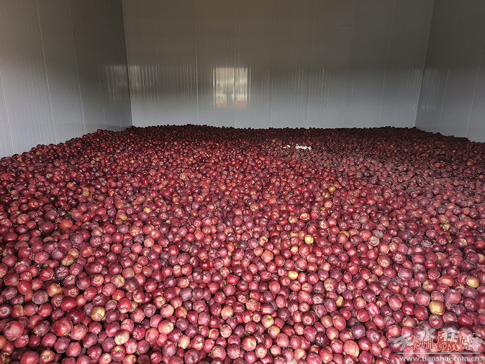在果园旁的冷库内,工人们正在对苹果进行分选、装箱。目前,已有不少省内外客商前来收购,苹果外销十分火爆。